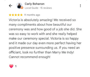 We are professional wedding officiants, Victoria and Peter Meyer.Victoria started Marry Me In Indy! LLC 15 years ago. Peter joined her in 2022.Peter performs civil ceremonies in our office.Victoria answers phones, emails, and will travel to your location to marry you!